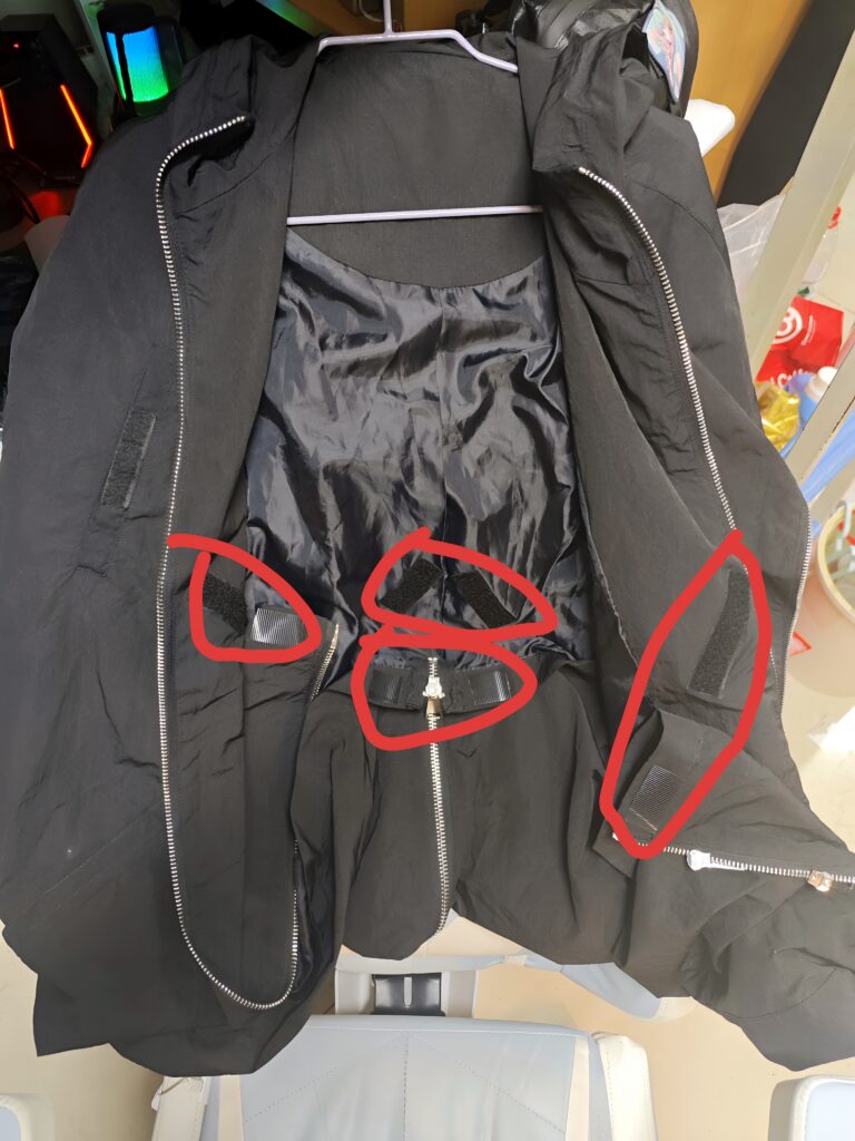 实际上只是简单的将风衣的下摆折叠上去,原作者使用四合扣连接,个人为减少外观变动选择使用盖隐的背胶魔术贴固定(如下图),后续如果位置合适大概会尝试将魔术贴与衣服缝死。盖隐的背胶魔术贴我每次粘布料都粘不牢,有钱了再买点盖隐的新款魔术贴试试。